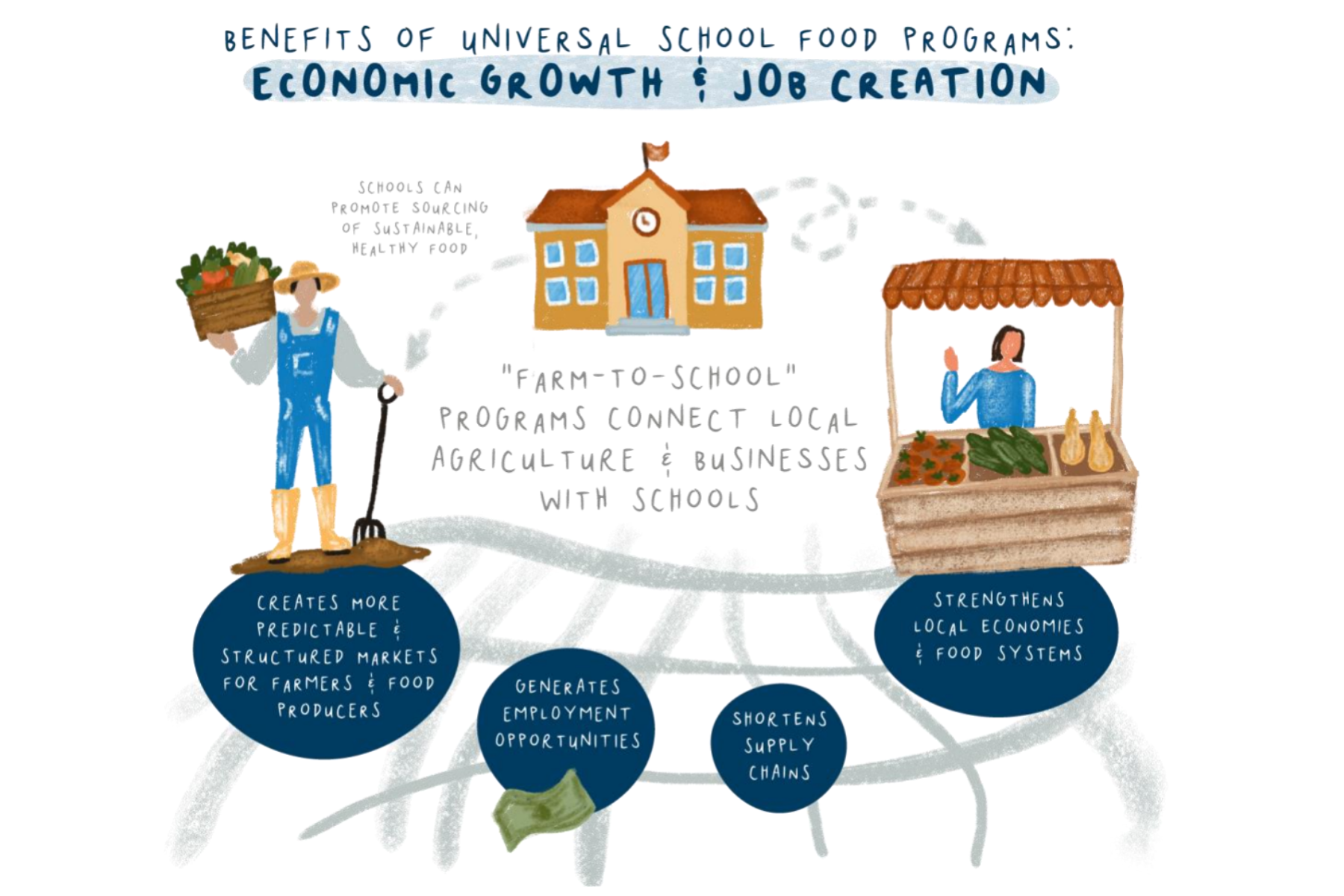 In adulthood, that former student continues to experience the positive effects of their school food program. They have spent less on healthcare, placing less strain on healthcare systems [10]. They earn a higher income, potentially lifting them out of poverty [11]. They see this amongst their classmates too, noticing more socioeconomic equity around them [12]. They are also part of a thriving local food system - one that spurs economic development and stimulates job creation [13].
